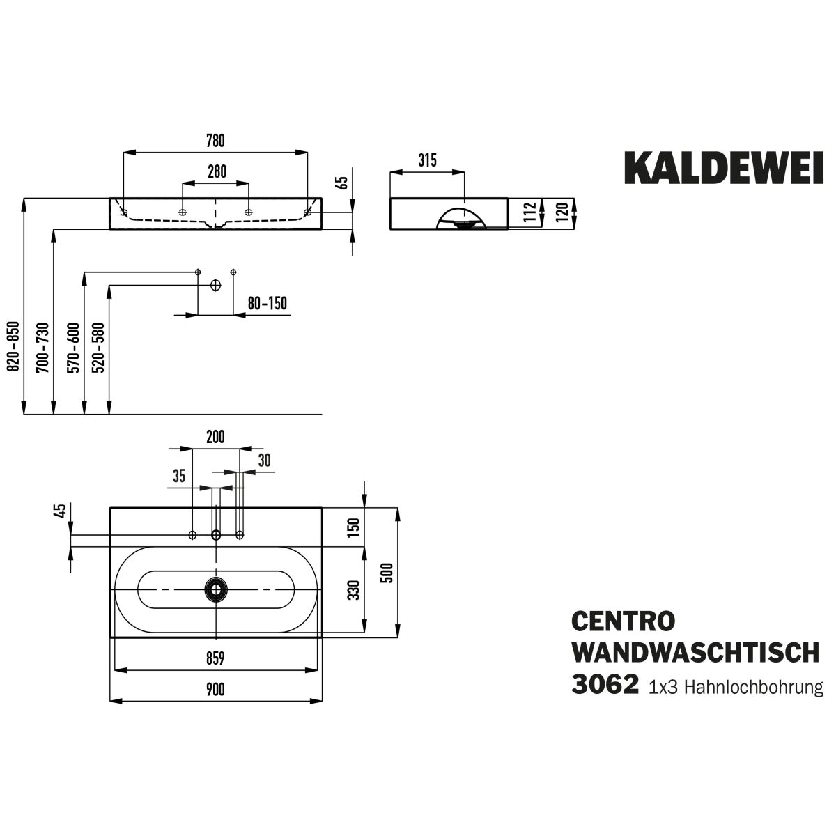 Kaldewei Centro Waschbecken 90x50 cm rechteckig Klassisch weiß 903506033001