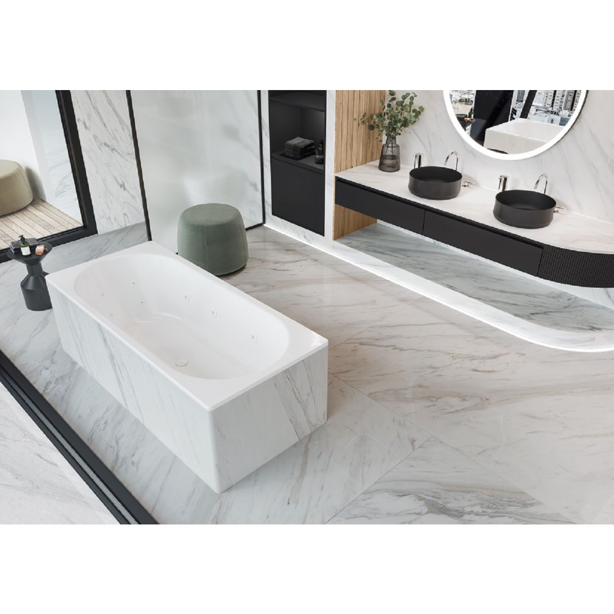 - Doppelbadewanne mit mittig angeordnetem Abfluss