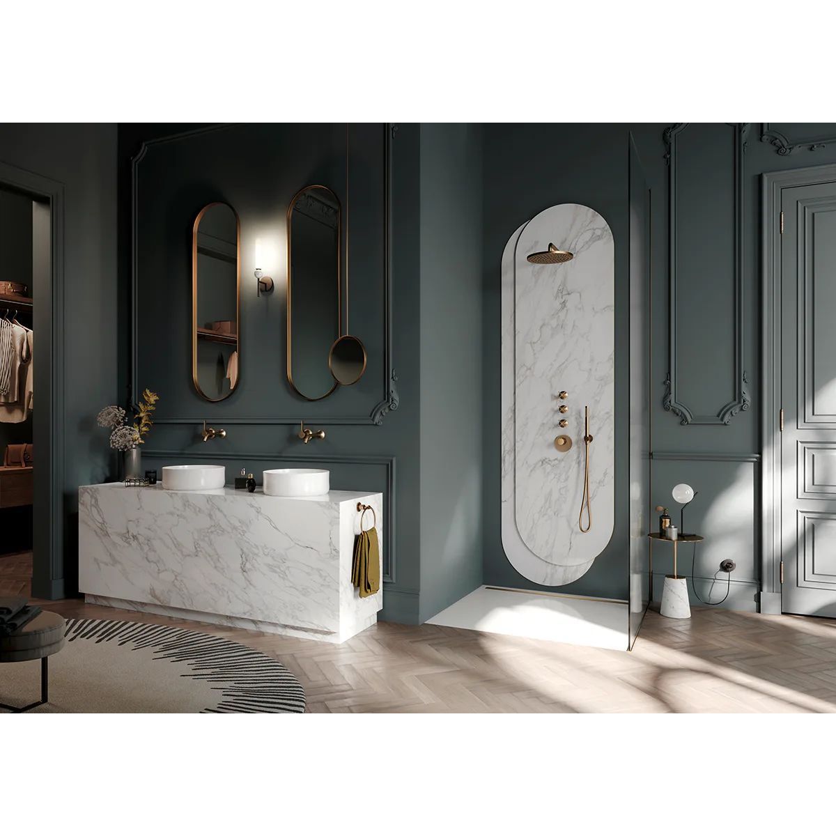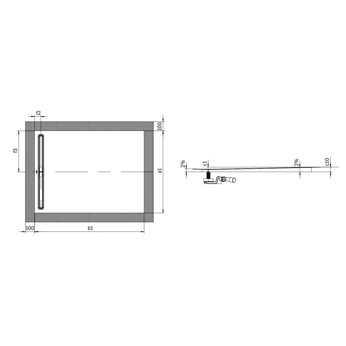 - vormontiertes 4-in-1-System, bestehend aus emaillierter Duschfläche, Linienablauf und Dichtungsband am Umfang, mit Gefälle und geformtem Gefälle auf beiden Seiten des Ablaufs