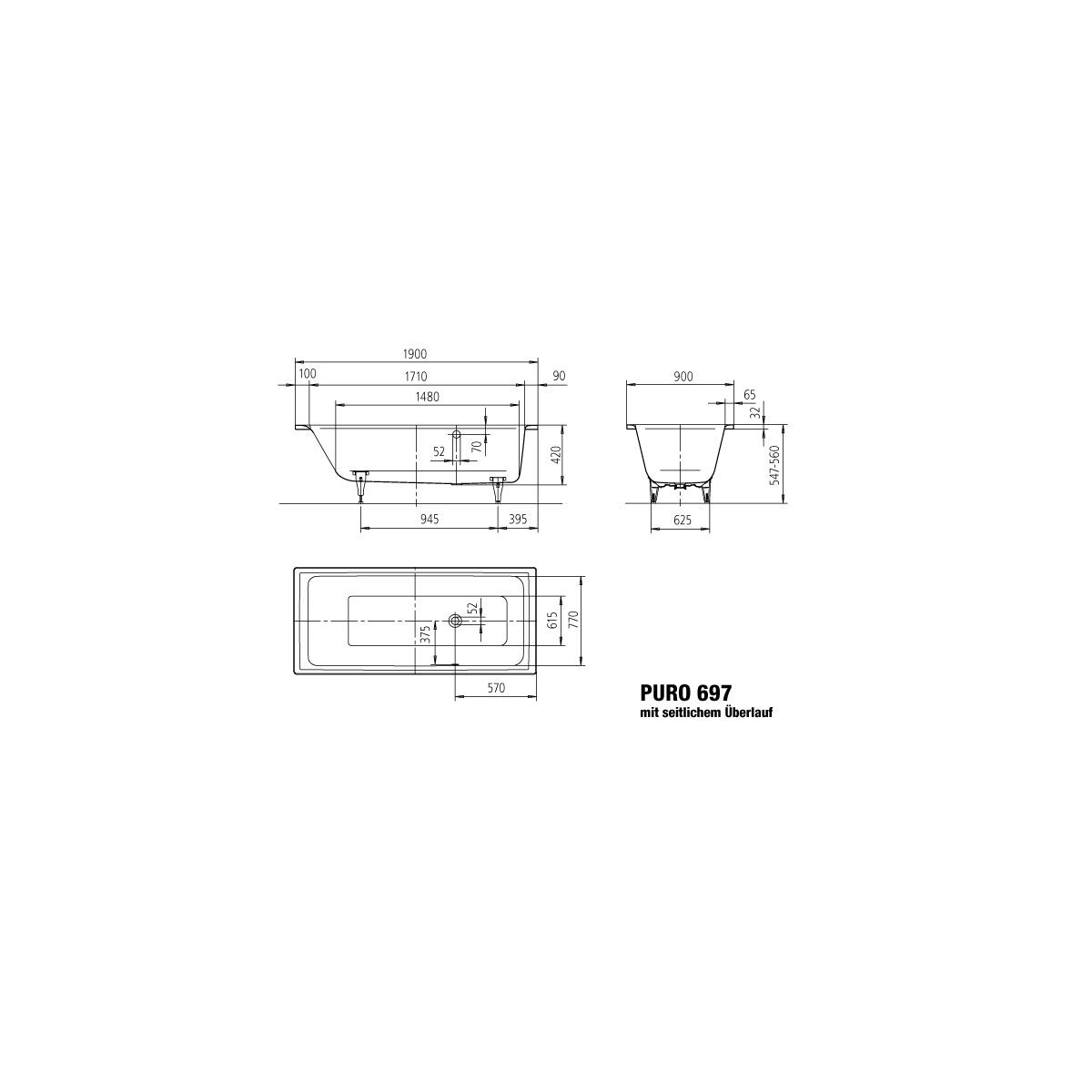 Die wichtigsten Merkmale der PURO-Badewanne mit seitlichem Überlauf: