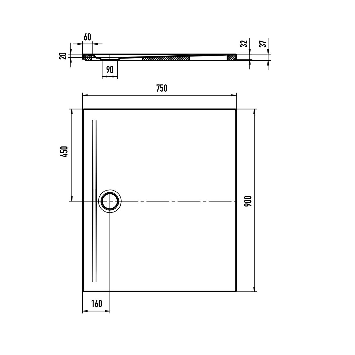 - Gesamthöhe der Duschwanne mit Träger – 3,7 cm