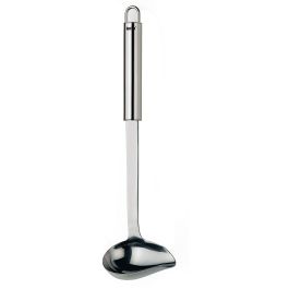 Rondo-Soßenlöffel mit Ausguss auf einer Seite zum Übergießen von Braten oder zum Servieren von Soßen. Der Löffel ist spülmaschinenfest und aus hochwertigem Edelstahl gefertigt. Mit Aufhängeschlaufe am Griff.