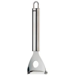 Rondo-Schäler mit beweglicher Klinge und kleinem Seitenschneider. Er ist 15,5 cm lang und 5,5 cm breit. Der Schäler ist spülmaschinenfest und aus hochwertigem Edelstahl gefertigt. Mit Aufhängeschlaufe am Griff.