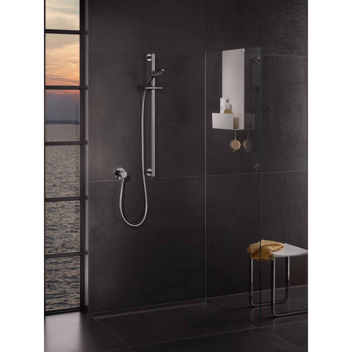 - einer 85,5 cm langen Stange, einer dekorativen Scheibe (rund) mit Halterung für den Duschkopf,