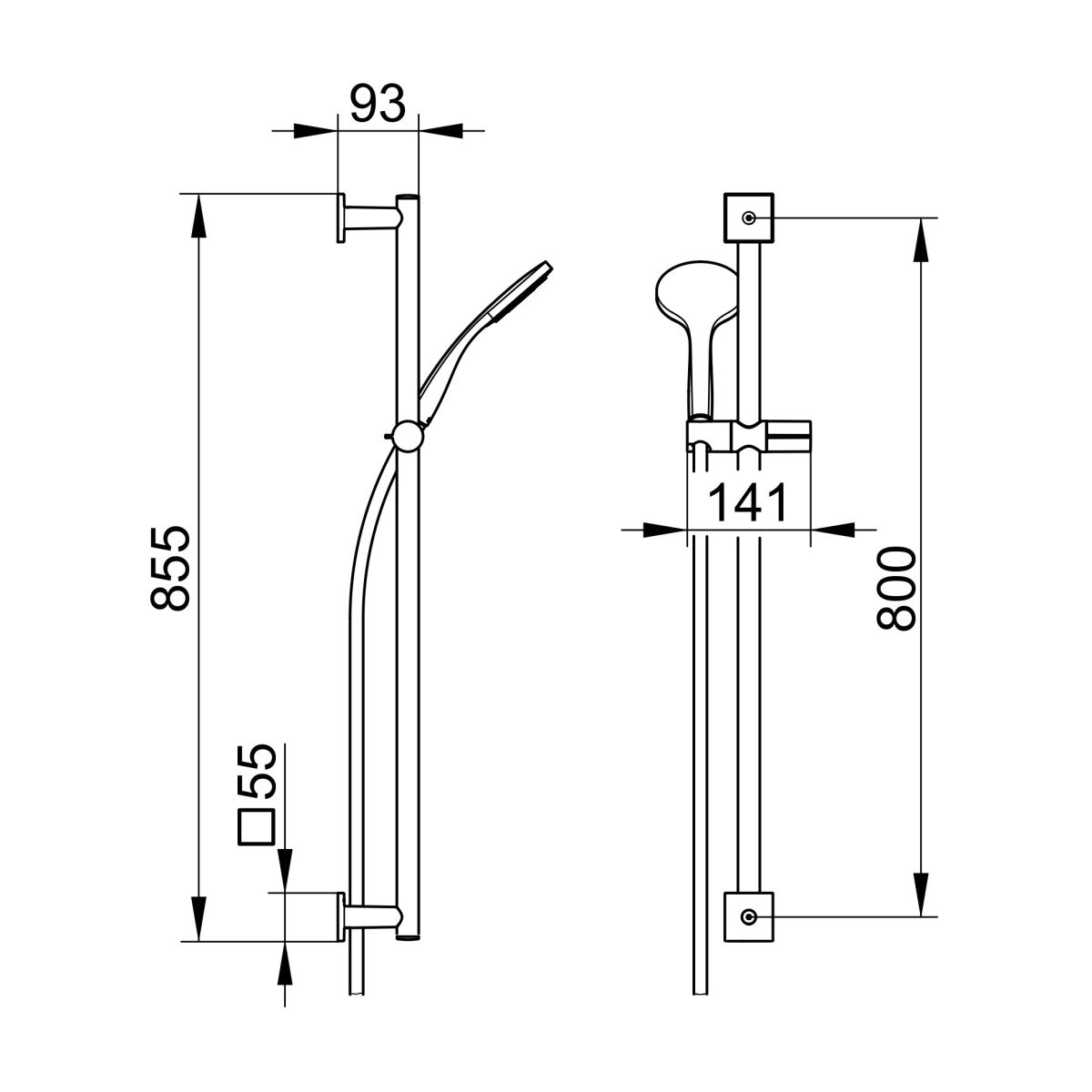 - einer 85,5 cm langen Reling, einer dekorativen Scheibe (quadratisch) mit Halterung für den Duschkopf,