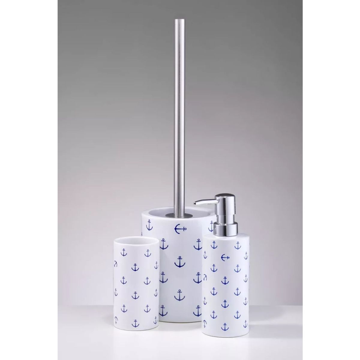 Die Serie der Badaccessoires Anchor, die mit ihrem Charakter an das Thema Meer anknüpft. Die maritimen „Anker”-Muster sind auf weißem Steingutgrund angebracht.
