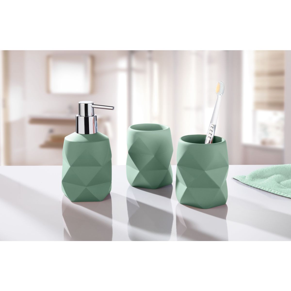 Das Badezimmer – hier beginnt und endet Ihr Tag. Aus diesem Grund sollte dieser Raum ganz nach Ihren Bedürfnissen gestaltet sein. Die Accessoire-Serie „Crackle” von Kleine Wolke vereint dekorative und praktische Aspekte. Die Kombination aus zeitlosen Farbtönen und einem interessanten Muster ist ein echter Blickfang. Dank einer speziellen Verarbeitungsmethode fühlen sich die Accessoires zudem angenehm und weich an.