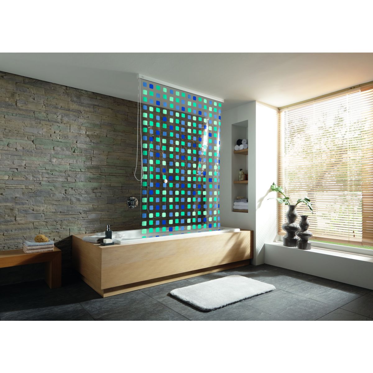 - Im aufgerollten Zustand verschwindet der Rollo ästhetisch in der Kassette, was viel Platz spart und das Badezimmer optisch vergrößert