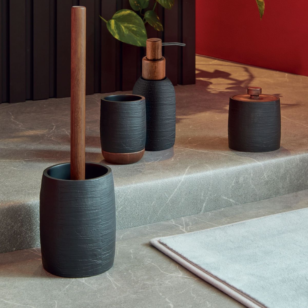 Die Serie Harper ist die perfekte Wahl für alle, die eine Kombination aus moderner Ästhetik, natürlichen Akzenten und hochwertiger Verarbeitung schätzen. Die matte, von Schiefer inspirierte Oberfläche, dunkelbrauner Bambus und robustes Polyresin bilden ein einzigartiges Set, das den Charakter jedes Badezimmers unterstreicht und Komfort im täglichen Gebrauch bietet.