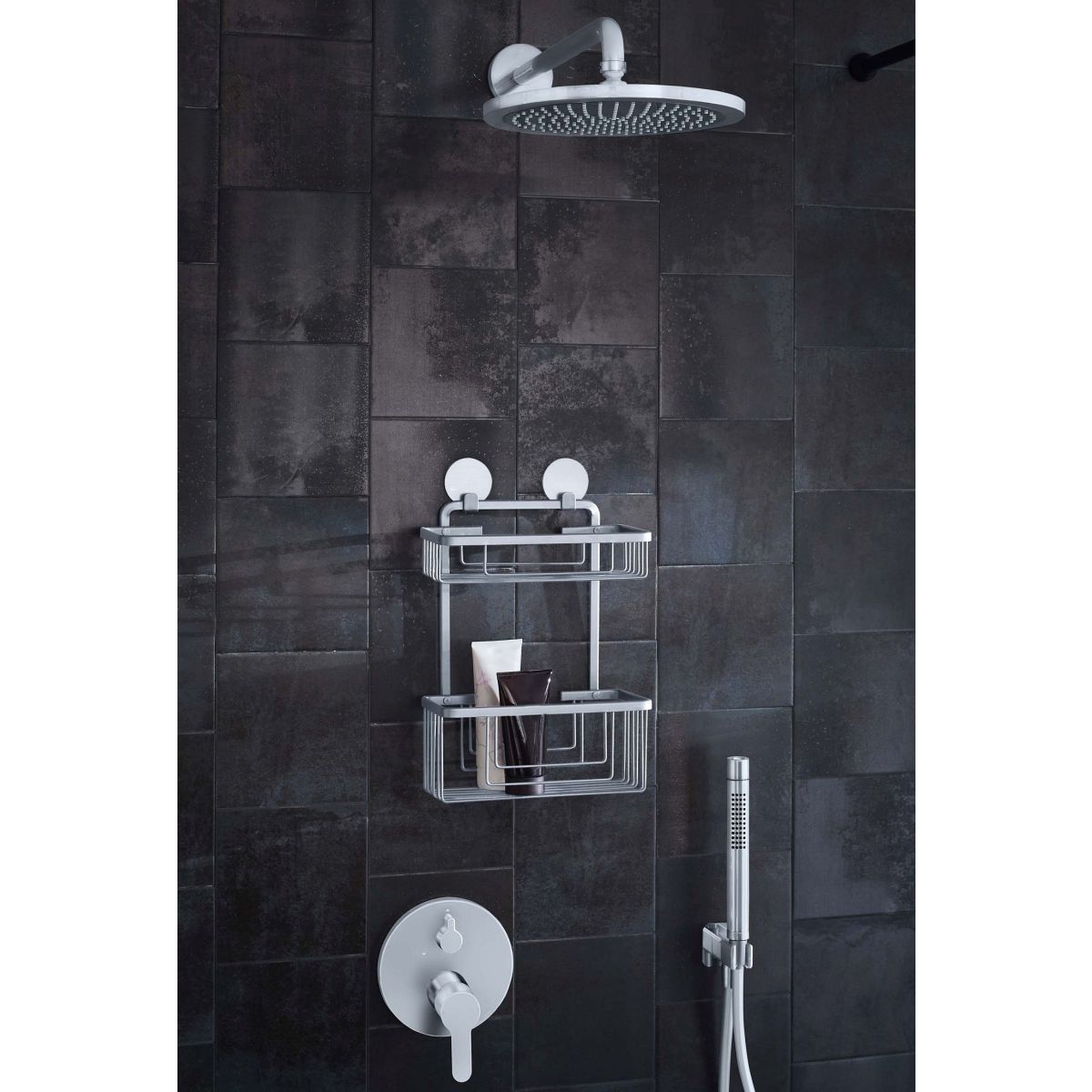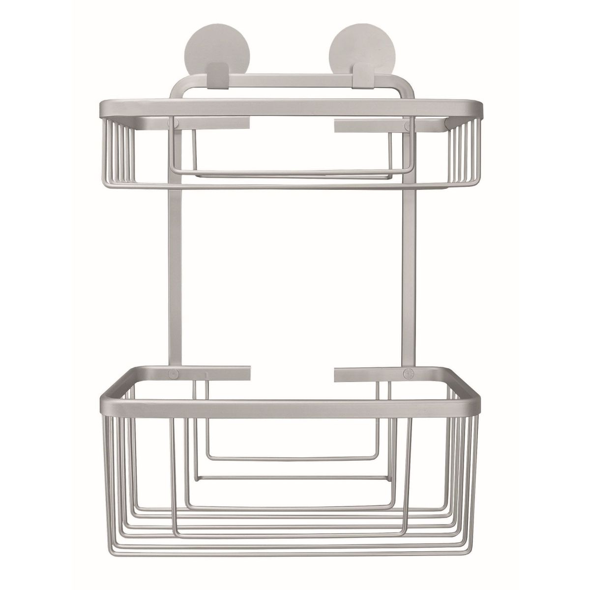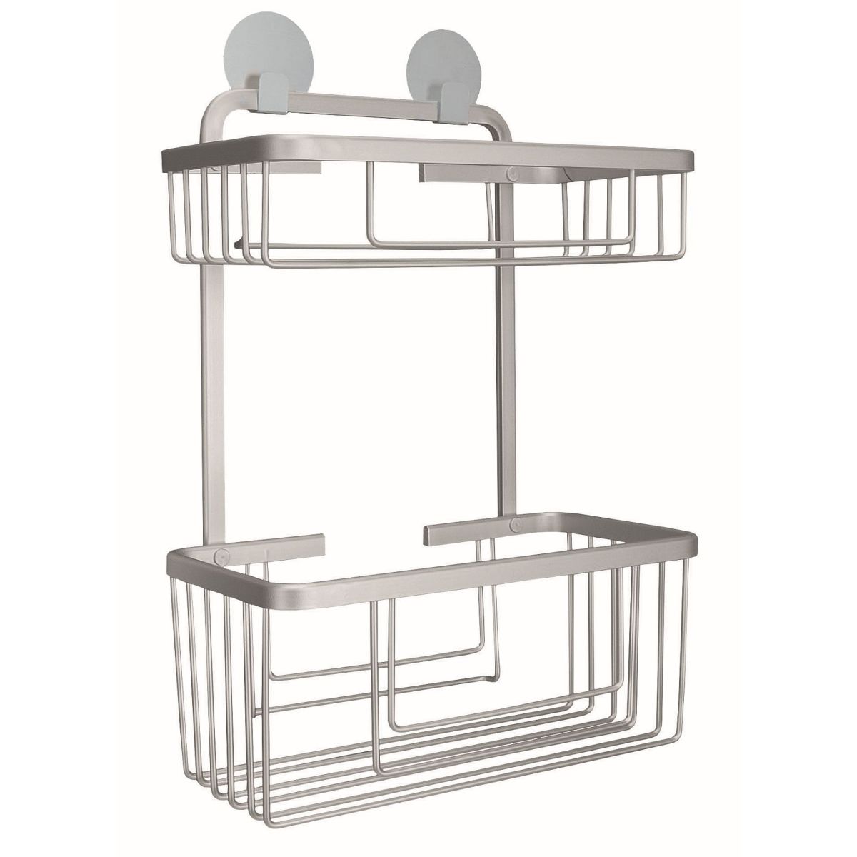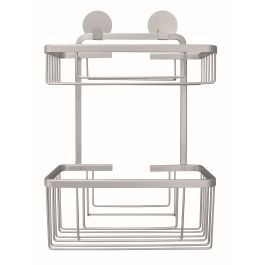 Doppelter Badkorb. Robuster und strapazierfähiger rechteckiger Duschkorb mit zwei Ebenen für Badaccessoires und Kosmetikartikel aus der Serie Rocco, der mit einem starken Montageband an der Wand befestigt wird.