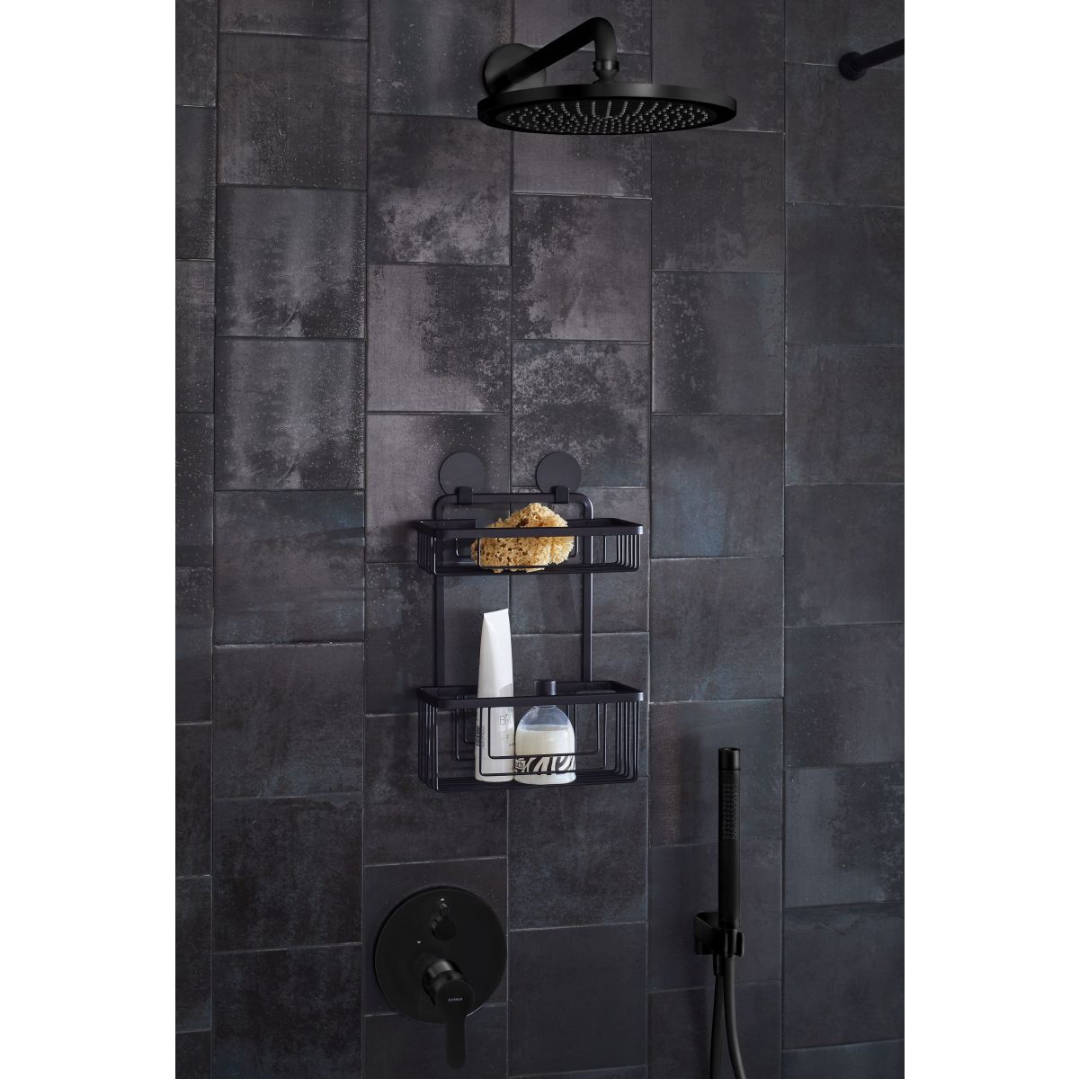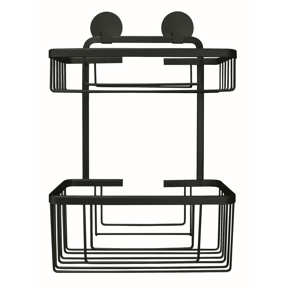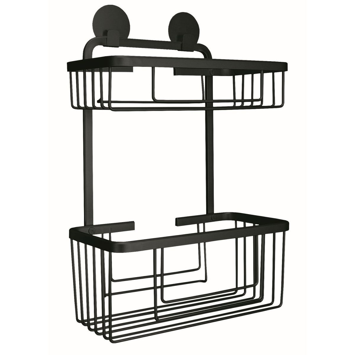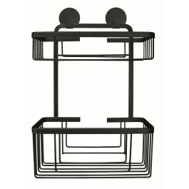 Doppelter Badkorb. Robuster und strapazierfähiger rechteckiger Duschkorb mit zwei Ebenen für Badaccessoires und Kosmetikartikel aus der Serie Rocco, der mit einem starken Montageband an der Wand befestigt wird.