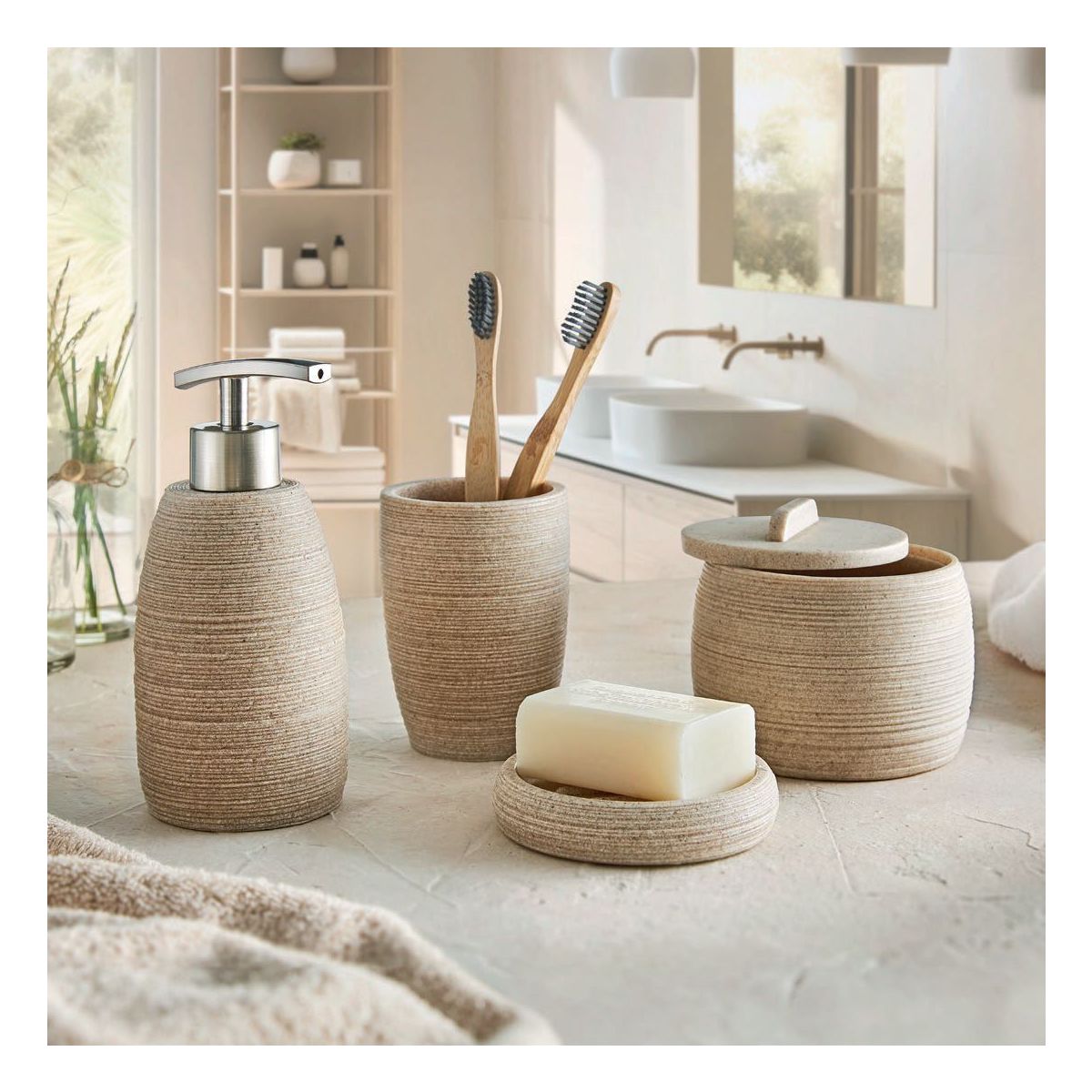 Die Serie Sand der Marke Kleine Wolke ist eine einzigartige Kollektion von Badaccessoires, die von natürlichen Farben und Strukturen inspiriert ist. Die Produkte werden aus dem modernen Keramikverbundwerkstoff Eco Care hergestellt, der zu mehr als der Hälfte aus recycelten Materialien besteht. Dieser ökologische Ansatz verbindet sich hier mit hoher Haltbarkeit, Widerstandsfähigkeit gegen Beschädigungen und einer eleganten Oberfläche.