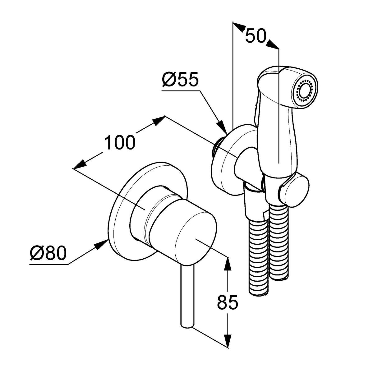 Komplettes Hygieneset mit Bidet. Es umfasst sowohl externe als auch interne, unter Putz montierte Elemente. Der ideale Ort für die Montage des Sets ist die Umgebung des Toilettensitzes. In Kombination mit diesem dient es als klassisches Bidet. Diese Lösung eignet sich besonders für kleine Badezimmer oder Toiletten.