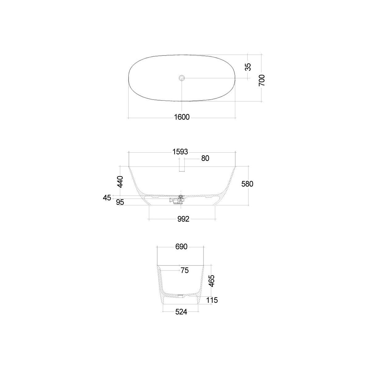Kludi Resa O Freistehende Badewanne 160x70 cm oval weiß 51BF0353
