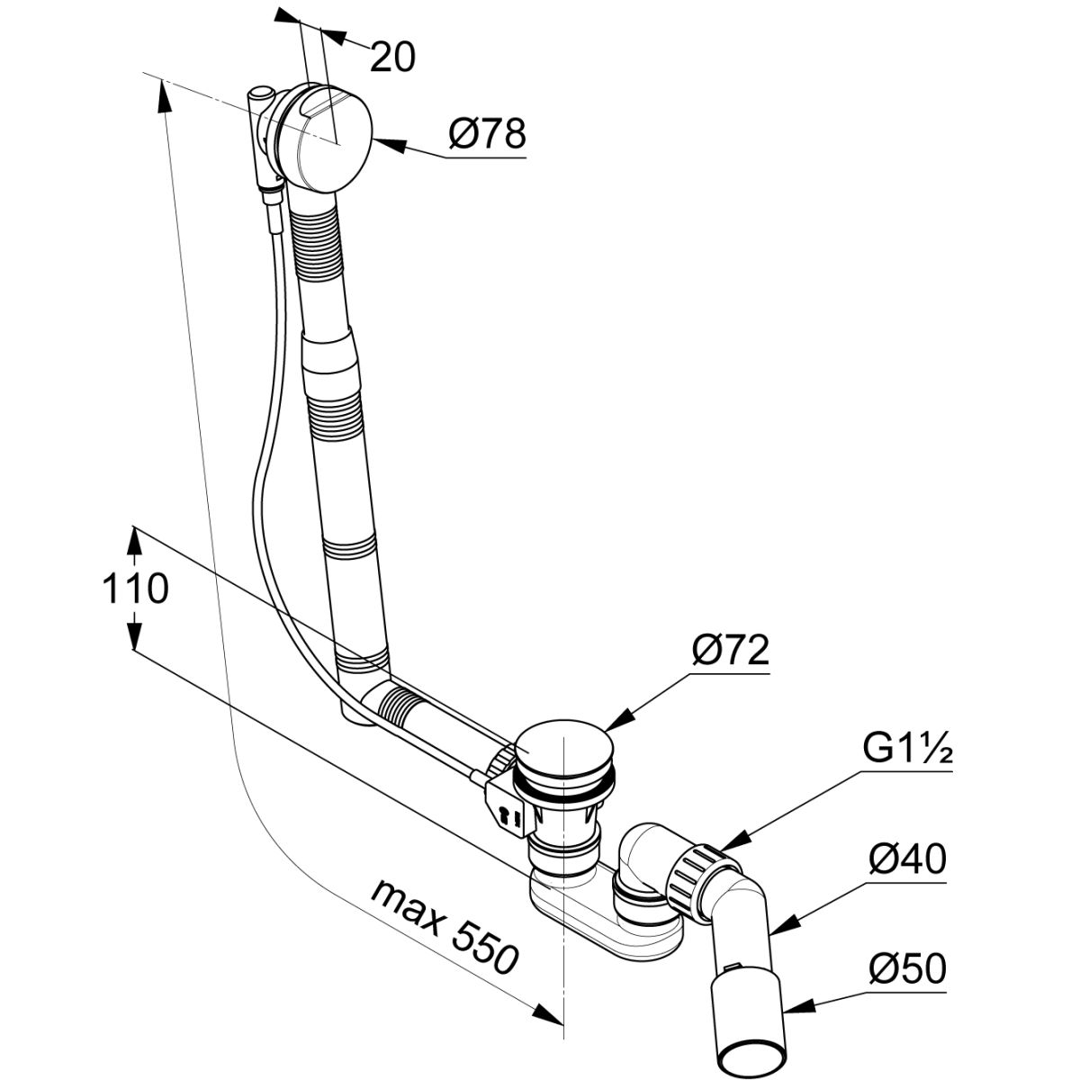 - Wassersäulenhöhe im Siphon 50 mm