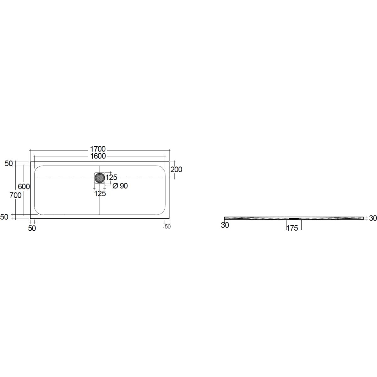 - Ablauf mittig entlang der Längsseite Ø 9 cm