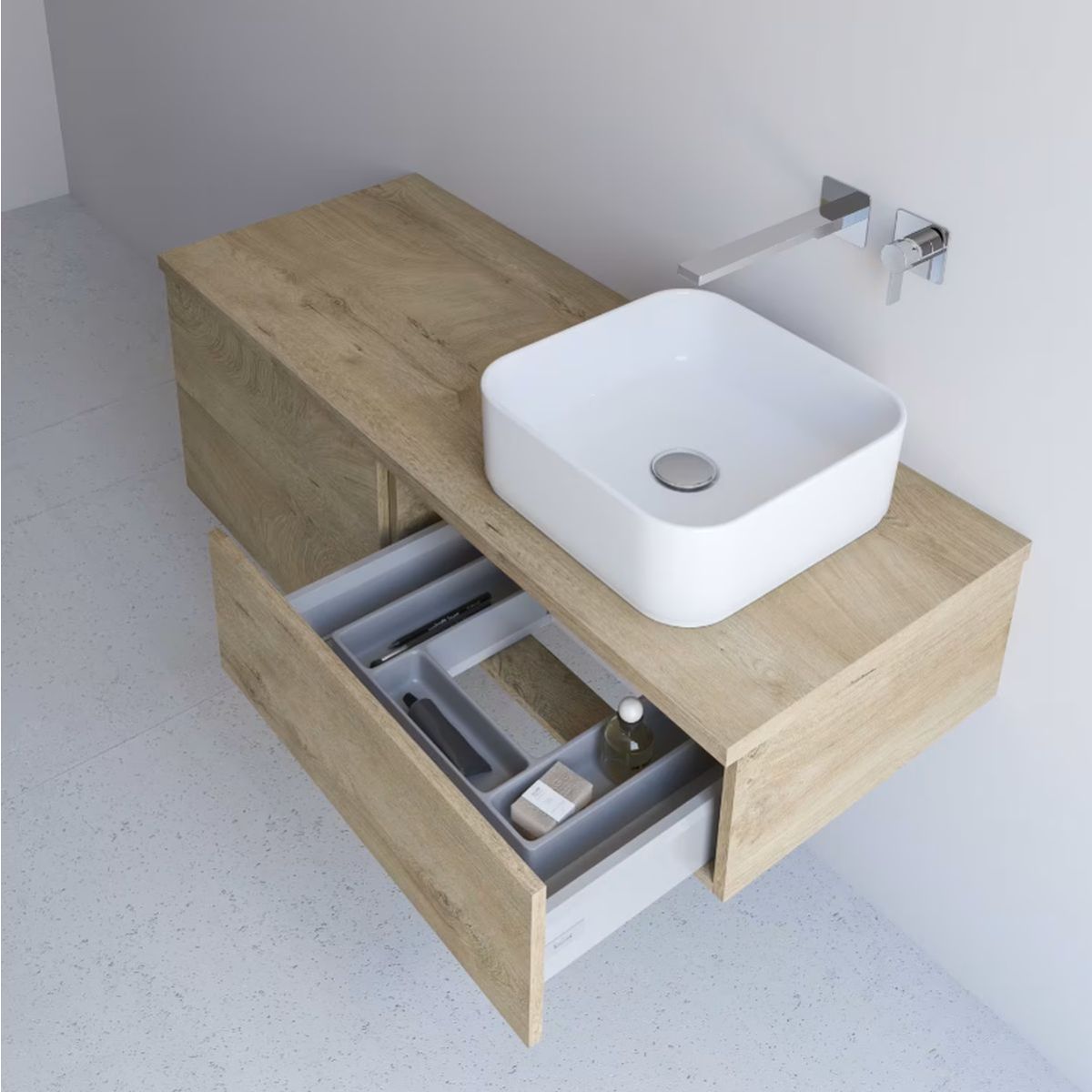 Waschtischunterschrank Kronenbach Cube 121 cm mit 2 Schubladen und Arbeitsplatte in heller Eiche