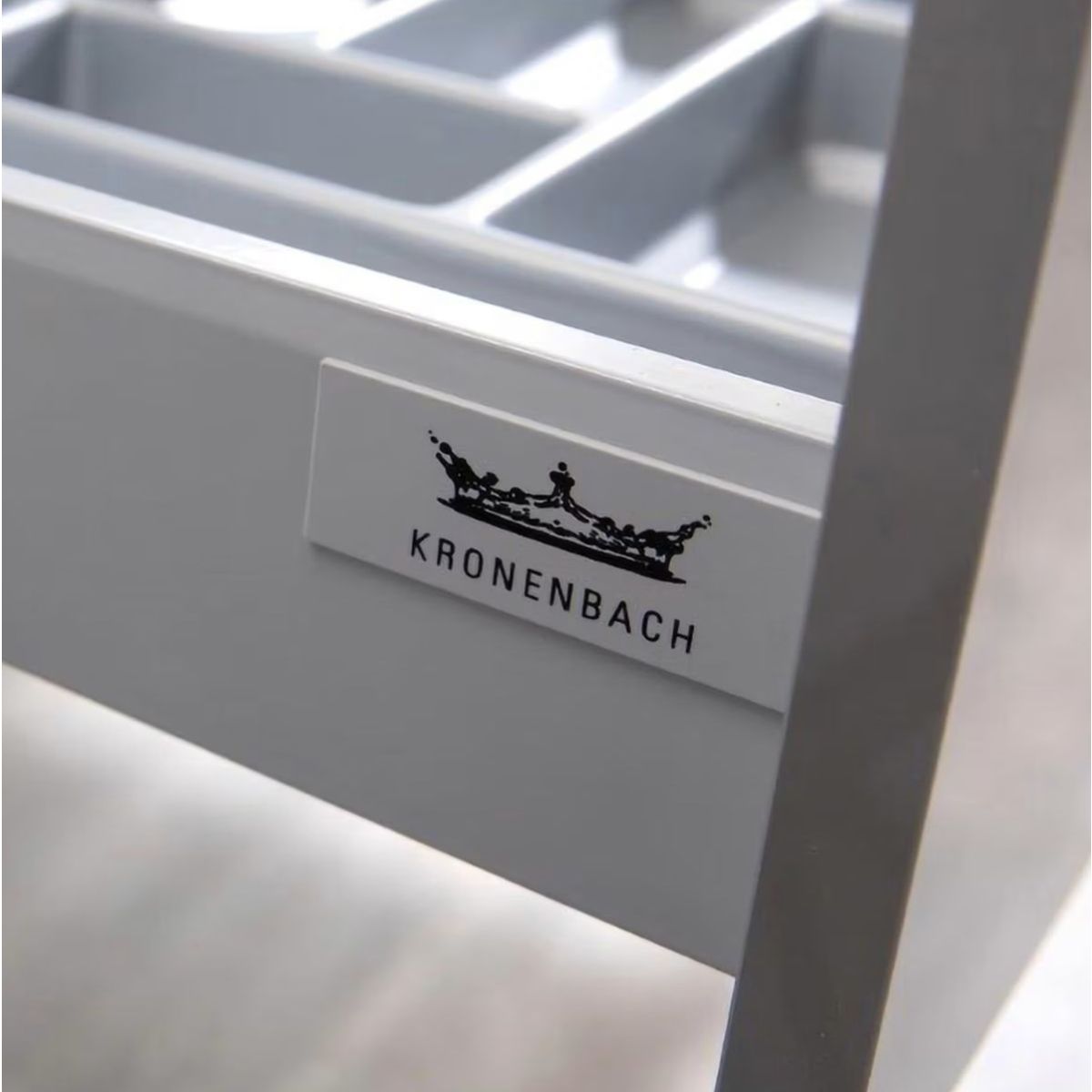 - Der Innenraum ist insgesamt dezent gehalten und umfasst Blum ANTARO-Schubkästen sowie Vollauszugschubkästen in Oriongrau mit farblich abgestimmten Kosmetikeinsätzen.