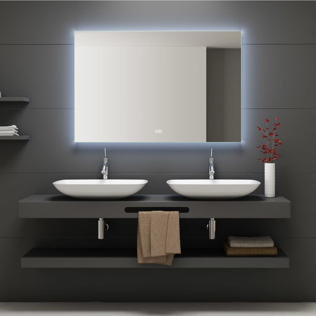 - mit in die Spiegelfläche integrierten Touch-Schaltern zum Ein-/Ausschalten, Dimmen und Verhindern von Beschlagen