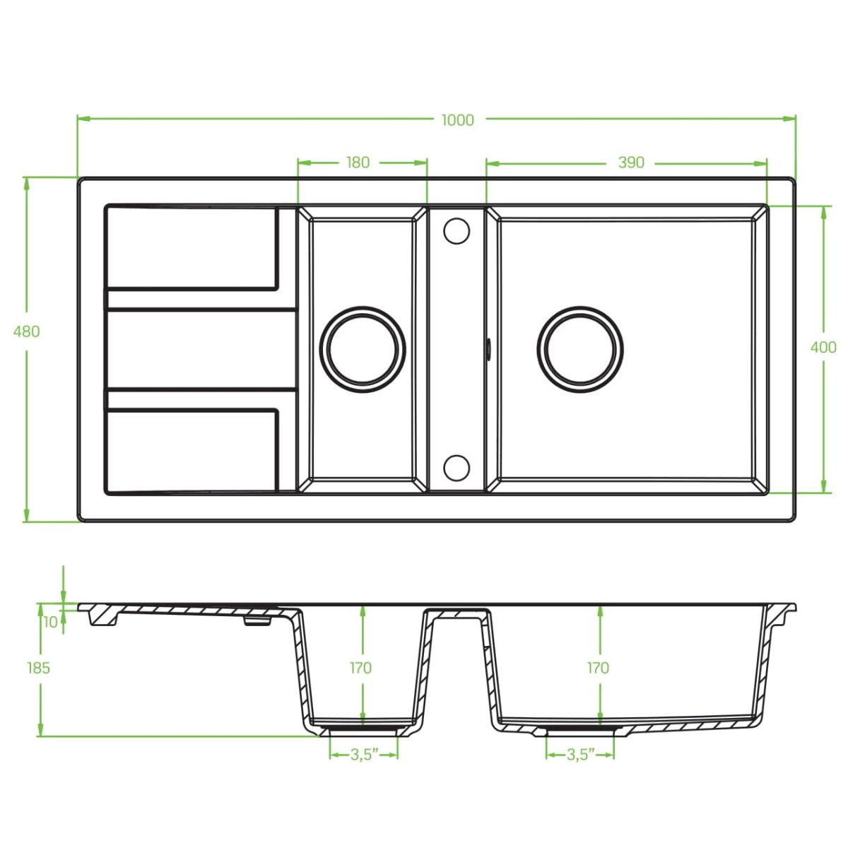 - Abmessungen der Becken 400 x 390 x 170 mm, 400 x 180 x 170 mm