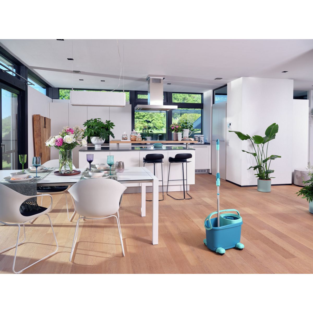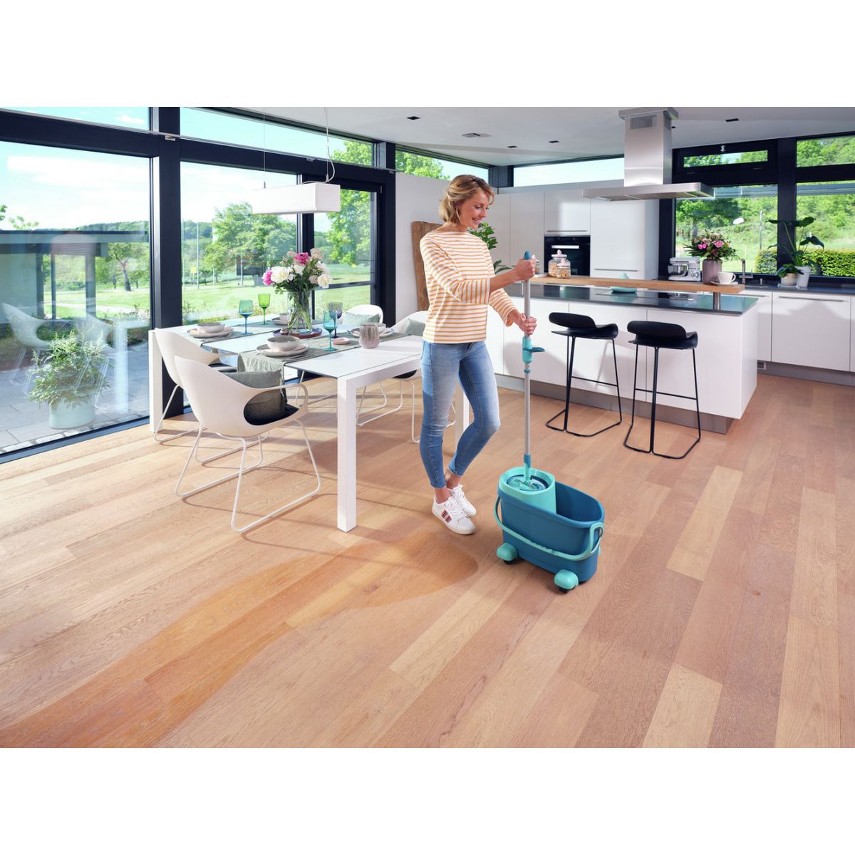 Mit dem Set Clean Twist M Ergo von Leifheit reinigen Sie jeden Boden effektiv, ohne sich die Hände schmutzig zu machen und sparen dabei Zeit. Das Auswringen des Mopps wird noch einfacher. Der Stiel und der Eimer sind aus strapazierfähigen, hochwertigen Materialien gefertigt. Dank des patentierten Schleudersystems des Mopps können Sie dessen Feuchtigkeit an die zu reinigende Oberfläche anpassen und überschüssiges Wasser und Schmutz perfekt aus dem Aufsatz entfernen. Außerdem muss man sich dabei nicht bücken, denn das Rotationssystem befindet sich im Stiel. Man muss nur die Verriegelung lösen und drücken, um den Mopp in Drehbewegung zu versetzen. Der Stiel kann auch ausgezogen werden, um seine Länge an die Körpergröße der benutzenden Person anzupassen. Das um 360° drehbare Gelenk ermöglicht es, den Boden bequem im Zickzack zu reinigen und schwer zugängliche Stellen zu erreichen, und die im Set enthaltenen Räder erleichtern das Transportieren des Eimers während der Arbeit erheblich.