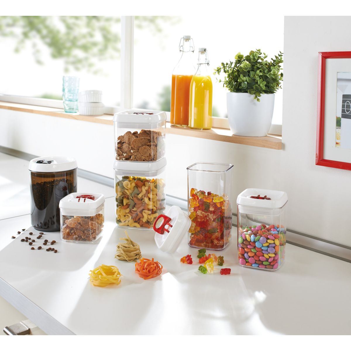 Dank des rechteckigen Behälters Fresh&Easy von Leifheit werden Lebensmittel sicher und hygienisch aufbewahrt und in Ihrer Küche oder Speisekammer herrscht Ordnung. Dieses Modell ist aus hochwertigem Kunststoff gefertigt. Der weiße Deckel verfügt über einen praktischen roten Griff. Das innovative Öffnungs- und Schließsystem lässt sich mit einer Hand bedienen. Um den Deckel abzunehmen, muss der Griff nach oben gezogen werden, zum dichten Verschließen reicht es, ihn nach unten zu drücken. Dieses Modell schützt den Inhalt vor Feuchtigkeit und sorgt für perfekte Luftdichtigkeit.