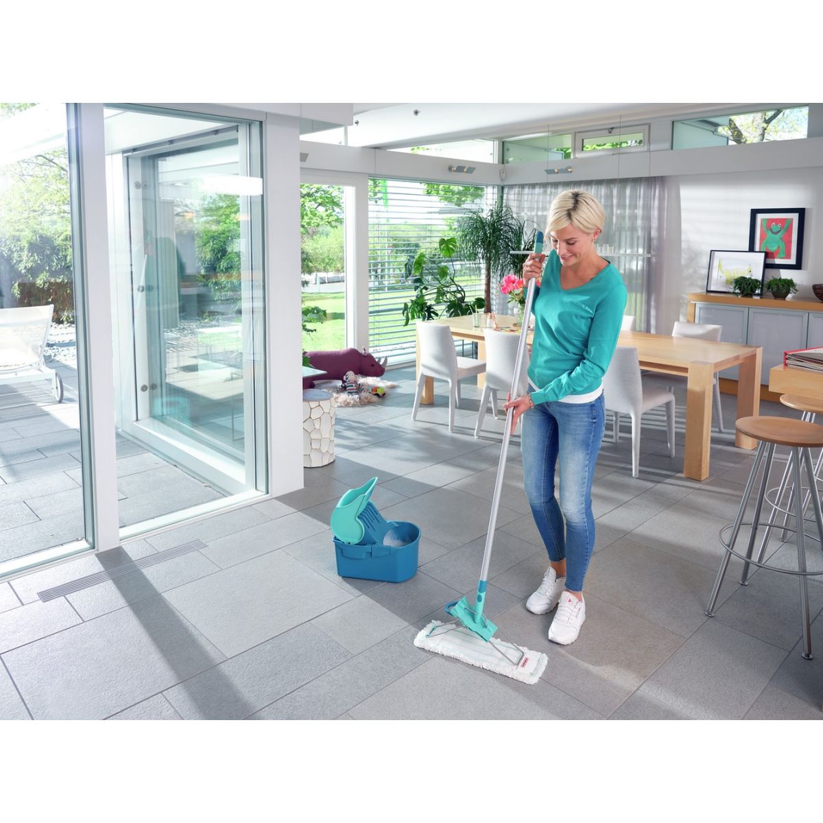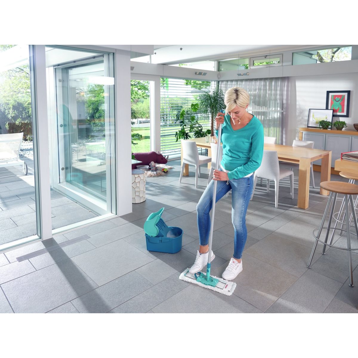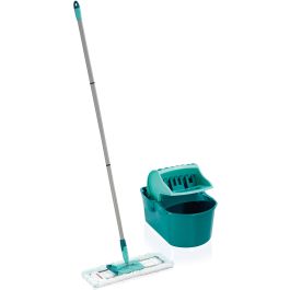 Das Profi Compact Set von Leifheit ist ein Spezialist für die gründliche Reinigung aller Arten von Oberflächen. Dieses Set enthält den einzigen Mopp auf dem Markt mit einem innovativen Auswringsystem, das durch Druck auf den Moppstiel funktioniert, ohne die Hände zu verschmutzen, sowie einem Klick-System.