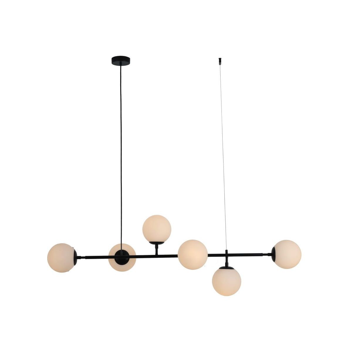 Die Hängelampe Alisa ist eine großartige Beleuchtungslösung für Häuser, Wohnungen und Büros. Sie verfügt über sechs transparente, kugelförmige Glaslampenschirme, die dank ihrer stilvollen Anordnung in verschiedenen Richtungen jeden Winkel des Raumes ausleuchten. Darüber hinaus bereichert ihre Form und Originalität die Inneneinrichtung. Die Kugeln sind weiß, der Metallrahmen der Lampe jedoch schwarz. Diese perfekte Kombination sorgt dafür, dass die Lampe auch bei häufigen Farbwechseln der Wände oder Möbel gut passt. So wird sie Ihnen viele Jahre lang Freude bereiten.