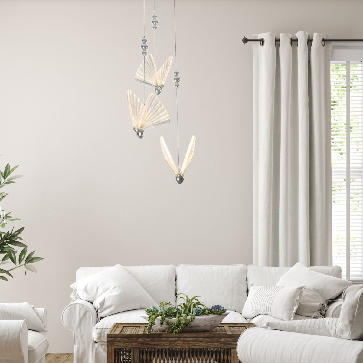 Die dreifache Hängelampe Mariposa ist nicht nur eine funktionale Beleuchtung, sondern auch ein elegantes und raffiniertes Dekorationselement, das jedes Interieur perfekt ergänzt. Diese Version der Lampe zeichnet sich durch die verchromte Farbe der Deckenrosette und des Gestells aus, was ihr ein modernes und glänzendes Aussehen verleiht. Die Mariposa-Lampe verfügt über eine integrierte LED-Beleuchtung, die dezent in den Schmetterlingsflügeln platziert ist. Dank der LED-CCT-Technologie (Correlated Color Temperature) kann die Lichtfarbe nach Ihren Vorlieben angepasst werden – von warm über neutral bis kalt. Die Lichtfarbe wird vor der Montage im Lampendach eingestellt. Die Lampe ist aus hochwertigem Acryl und Metall gefertigt und zeichnet sich durch sorgfältige Verarbeitung und Liebe zum Detail aus.
