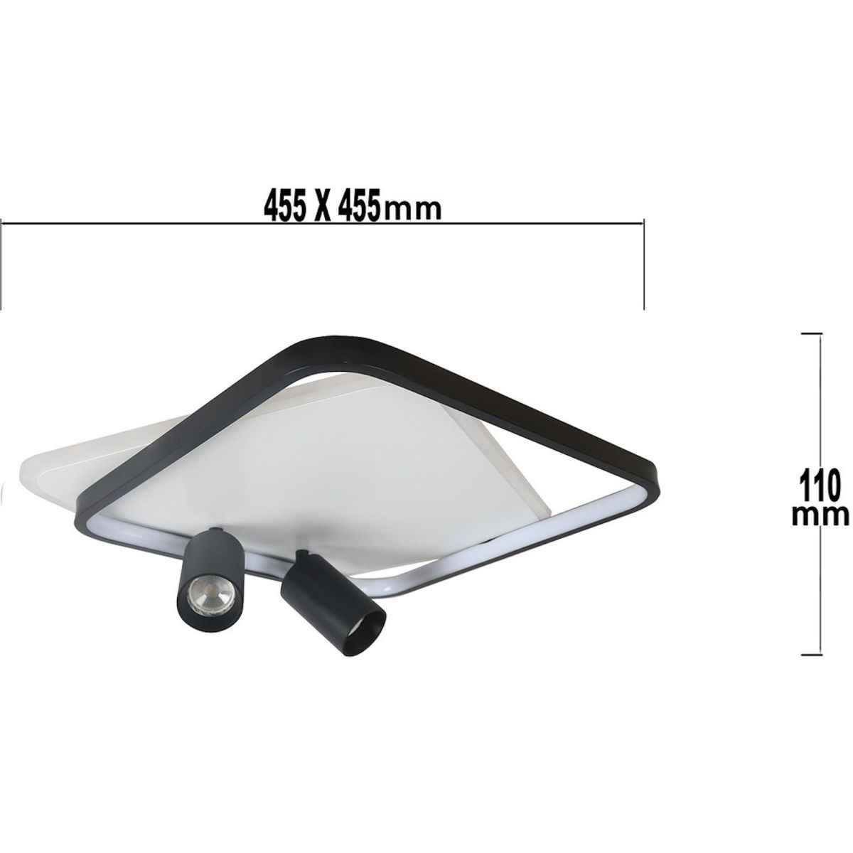 Die Deckenleuchte Parma 2 besteht aus schwarzem Metall und Acryl. Sie verfügt über zwei bewegliche Strahler mit austauschbaren Ringen, wobei Sie zwischen schwarzen und goldenen Ringen wählen können (beide Versionen sind im Lieferumfang enthalten). Durch die Neigungsverstellung der Strahler kann die Lichtrichtung genau auf den gewünschten Bereich ausgerichtet werden, z. B. auf den Schreibtisch. Die Deckenleuchte bietet Platz für GU10-Glühbirnen und verfügt über eine integrierte LED-Leuchte mit variabler CCT-Lichtfarbe, d. h. Sie können die LED-Lichtfarbe von warm über neutral bis kalt frei einstellen. Die Lichtfarbe wird vor der Montage in der Deckenleuchte eingestellt.