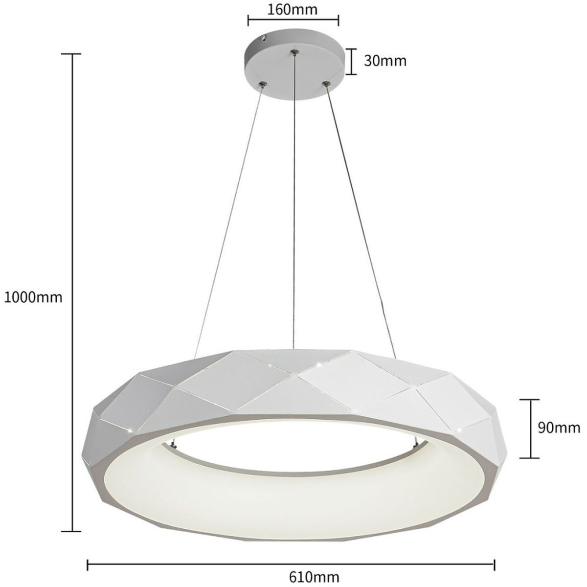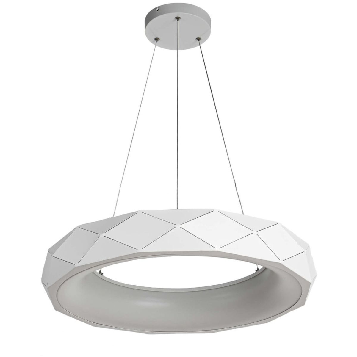 Der große Lampenschirm der Reus-Lampe ist in Form eines interessanten Rings mit eingebauter LED-Beleuchtung gestaltet. Er wurde in einem modernen Stil entworfen. Seine weiße Oberseite sieht durch das Steppmuster und den schönen Hochglanz sehr glamourös aus. Er hat eine neutrale Lichtfarbe.