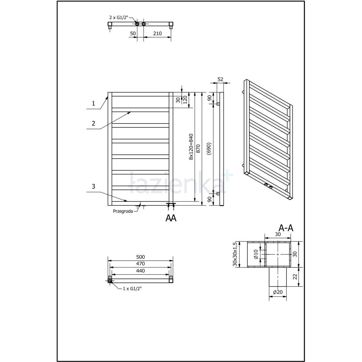 - horizontale Rohre: quadratisch 30 x 30 mm