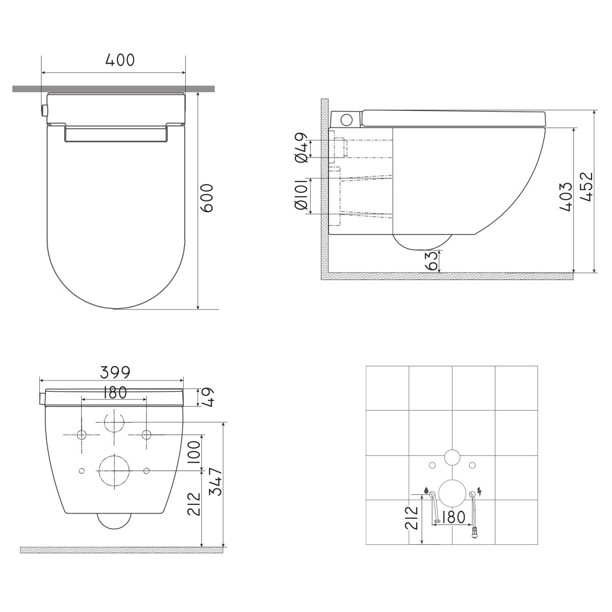 • Montageart: Hängende Toilettenschüssel, Montage an einem Unterputzgestell mit Wassertank und Spülknopf