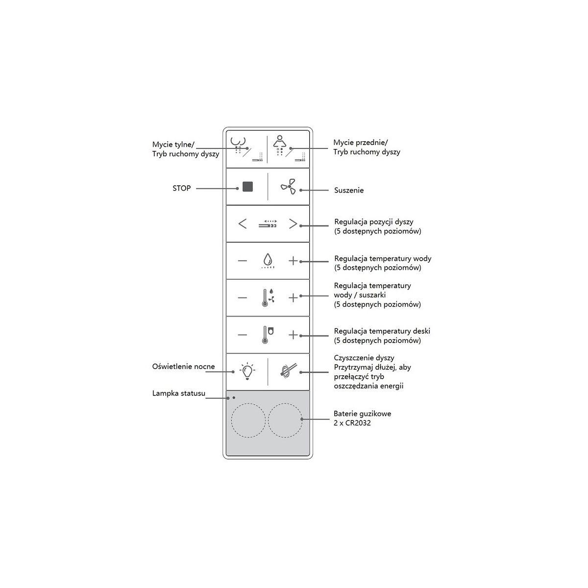 • Option zum Umschalten des Düsenbetriebsmodus (Punktreinigung, Massage, Turbomodus mit intensiver Wasserpulsation, der den Stuhlgang unterstützt)