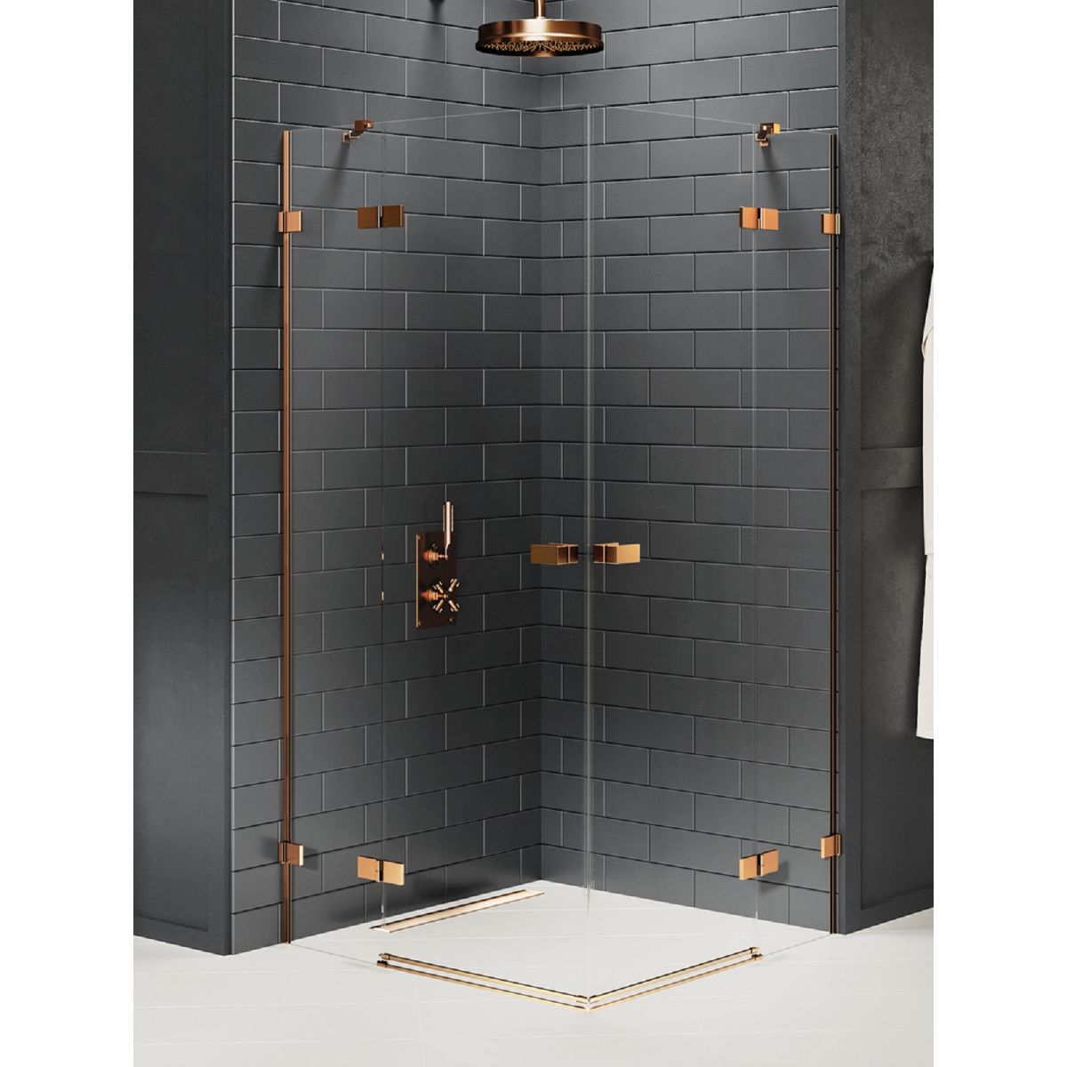 Das Modell Avexa Copper Brushed verfügt über elegante Details in Kupferfarbe mit gebürsteter Oberfläche. Die Duschtüren sind mit einer 6 mm starken, gehärteten Sicherheitsglasscheibe mit Active Shield 2.0-Schutzbeschichtung ausgestattet. Im unteren Teil der Tür befindet sich eine Rinne, die das Wasser von der Scheibe in den Duschbereich ableitet. Das Produkt kann mit oder ohne Duschwanne installiert werden.