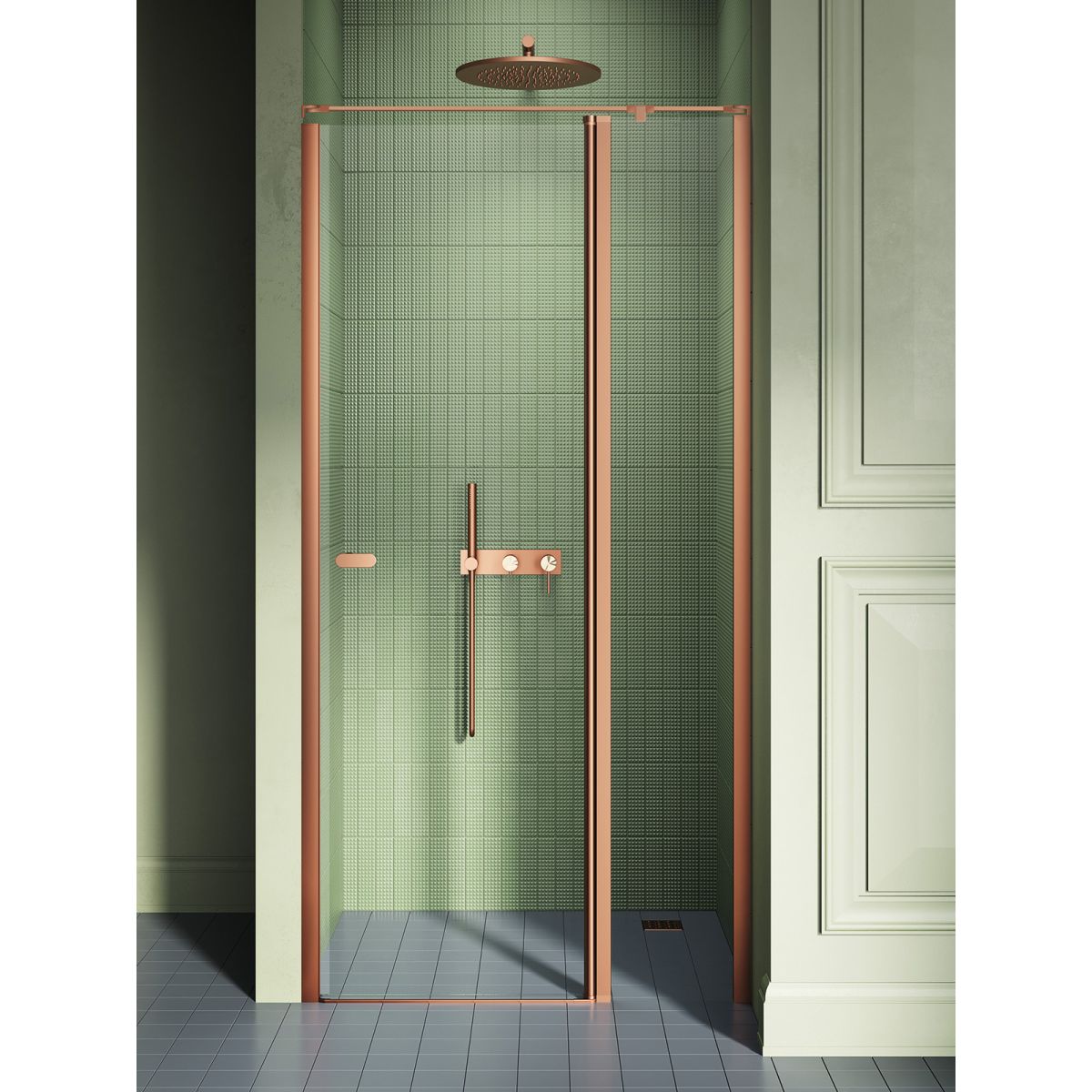 Das Modell New Soleo Copper Brushed verfügt über elegante Kupferdetails mit gebürsteter Oberfläche. Die Duschtür mit Parallelhalterung ist mit 6 mm starken, gehärteten Sicherheitsgläsern mit Active Shield 2.0-Schutzbeschichtung ausgestattet. Sie verfügt über ein Säulenscharnier, mit dem sich die Tür nach außen und innen öffnen lässt. Das Produkt kann mit oder ohne Duschwanne installiert werden.