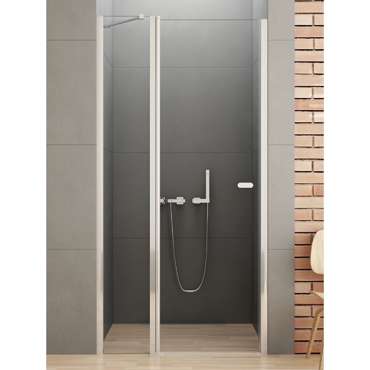 Das Modell New Soleo verfügt über elegante, verchromte Details mit glänzender Oberfläche. Die Duschtür mit schräger Halterung ist mit 6 mm starken, gehärteten Sicherheitsgläsern mit Active Shield 2.0-Schutzbeschichtung ausgestattet. Sie verfügt über ein Säulenscharnier, mit dem sich die Tür nach außen und innen öffnen lässt. Das Produkt kann mit oder ohne Duschwanne installiert werden. Version mit rechtwinkligem Ständer.