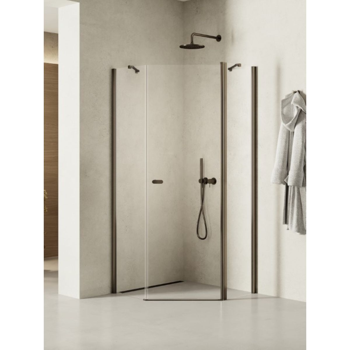 Das Modell New Soleo Gunmetal Brushed verfügt über elegante Details in Gunmetal mit gebürsteter Oberfläche. Die Duschkabinen sind mit 6 mm starken Sicherheitsgläsern mit Active Shield 2.0-Schutzbeschichtung ausgestattet. Sie verfügen über ein Säulenscharnier, mit dem sich die Tür nach außen und innen öffnen lässt. Das Produkt kann mit oder ohne Duschwanne installiert werden.