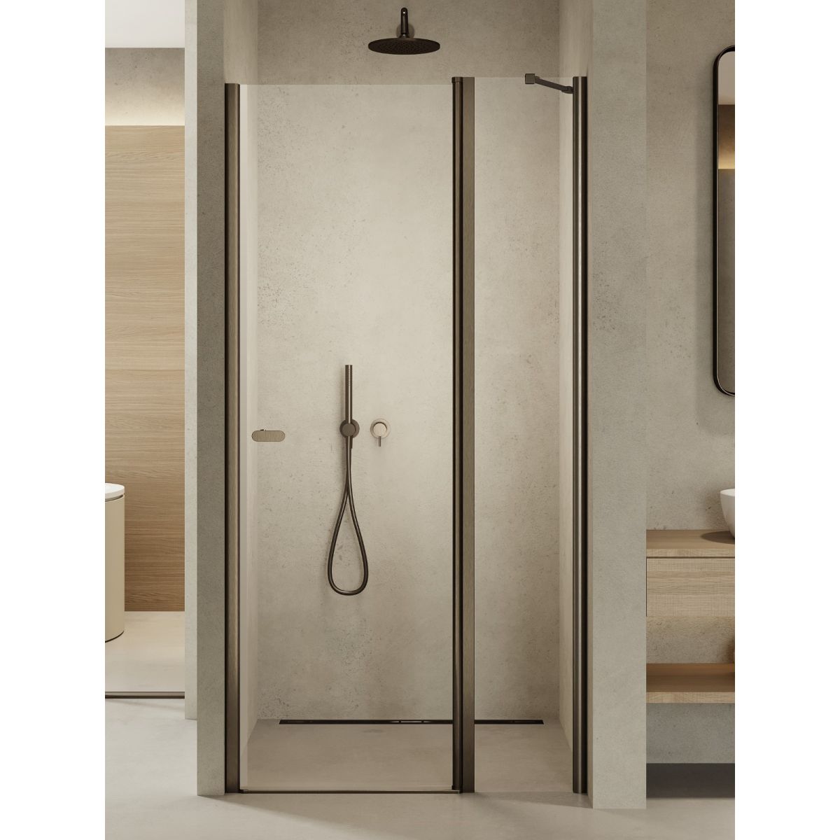Das Modell New Soleo Gunmetal Brushed verfügt über elegante Details in Gunmetal mit gebürsteter Oberfläche. Die Duschtür mit schräger Halterung ist mit 6 mm starken, gehärteten Sicherheitsgläsern mit Active Shield 2.0-Schutzbeschichtung ausgestattet. Sie verfügt über ein Säulenscharnier, mit dem sich die Tür nach außen und innen öffnen lässt. Das Produkt kann mit oder ohne Duschwanne installiert werden.