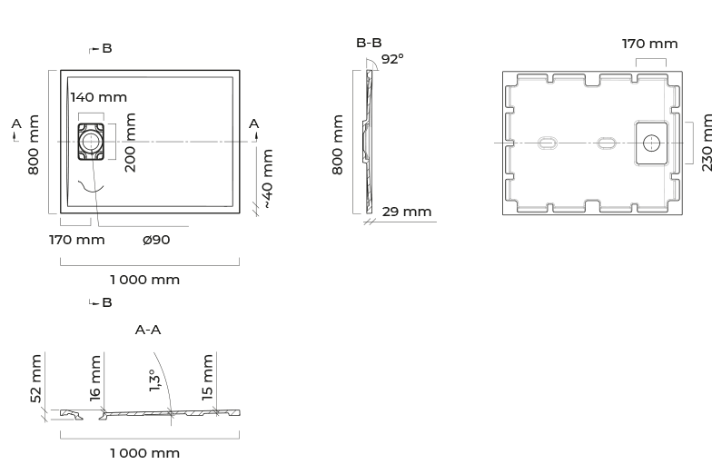 Duschwanne hat eine ästhetisch ansprechende Ablaufabdeckung aus dem gleichen Material wie die Duschwanne. Textur auf der Oberfläche der Duschwanne mit Gleitschutzeigenschaften. Die Duschwanne kann auf nicht standardisierte Maße zugeschnitten werden (eigener Zuschnitt).