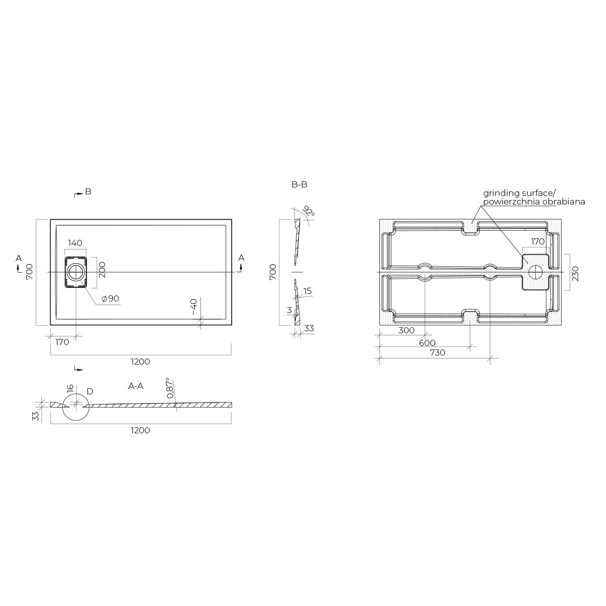 - Die Duschwanne verfügt über eine ästhetische Abflussabdeckung aus dem gleichen Material wie die Duschwanne mit den Maßen 20 x 14 cm