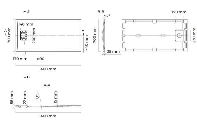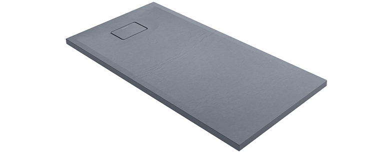Duschwanne hat eine ästhetisch ansprechende Ablaufabdeckung aus dem gleichen Material wie die Duschwanne. Textur auf der Oberfläche der Duschwanne mit Gleitschutzeigenschaften. Die Duschwanne kann auf nicht standardisierte Maße zugeschnitten werden (eigener Zuschnitt).