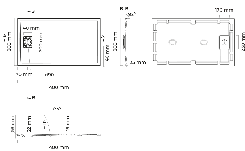 Duschwanne hat eine ästhetisch ansprechende Ablaufabdeckung aus dem gleichen Material wie die Duschwanne. Textur auf der Oberfläche der Duschwanne mit Gleitschutzeigenschaften. Die Duschwanne kann auf nicht standardisierte Maße zugeschnitten werden (eigener Zuschnitt).
