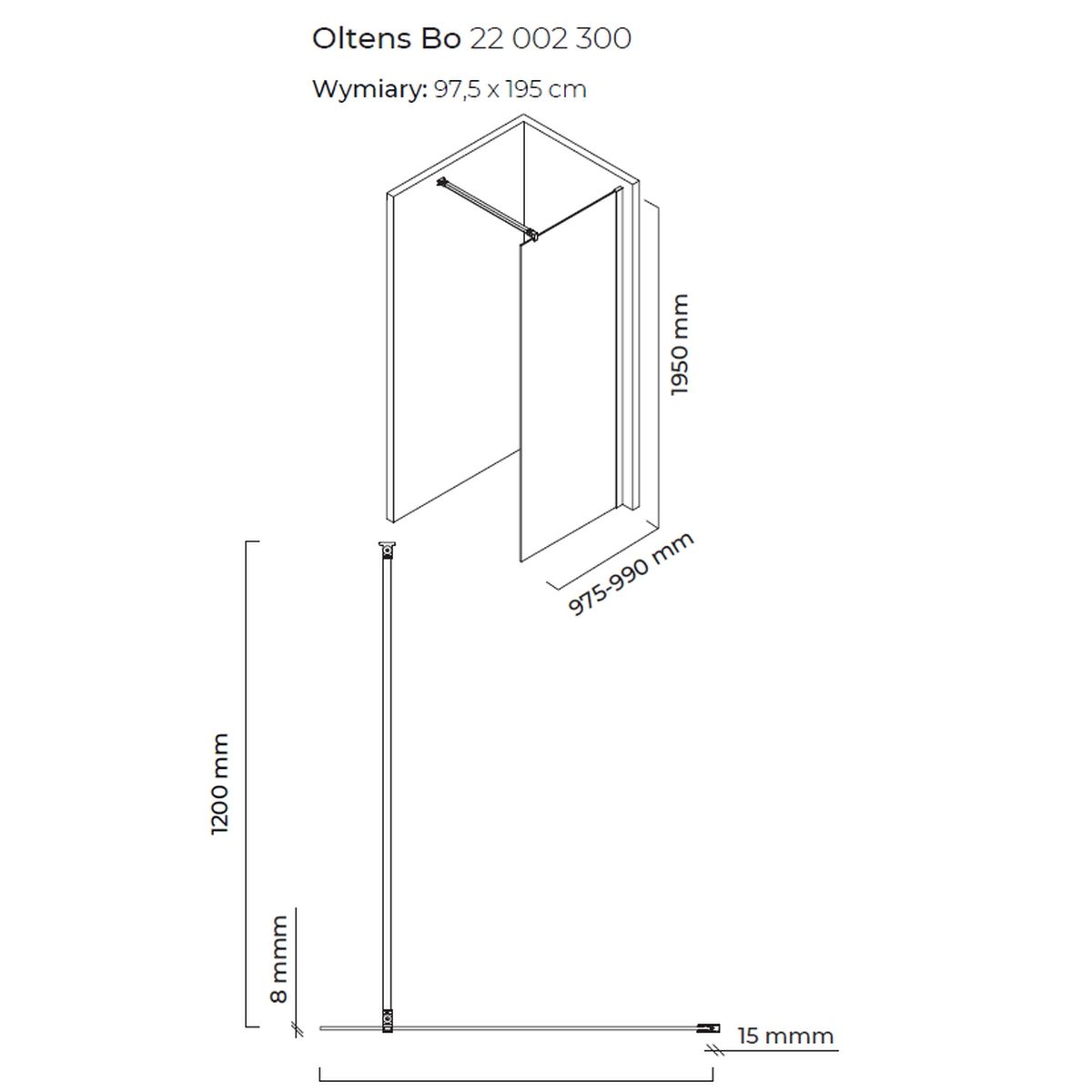Oltens Bo Duschwand 100 cm schwarz Matte/durchsichtiges Glas 22002300