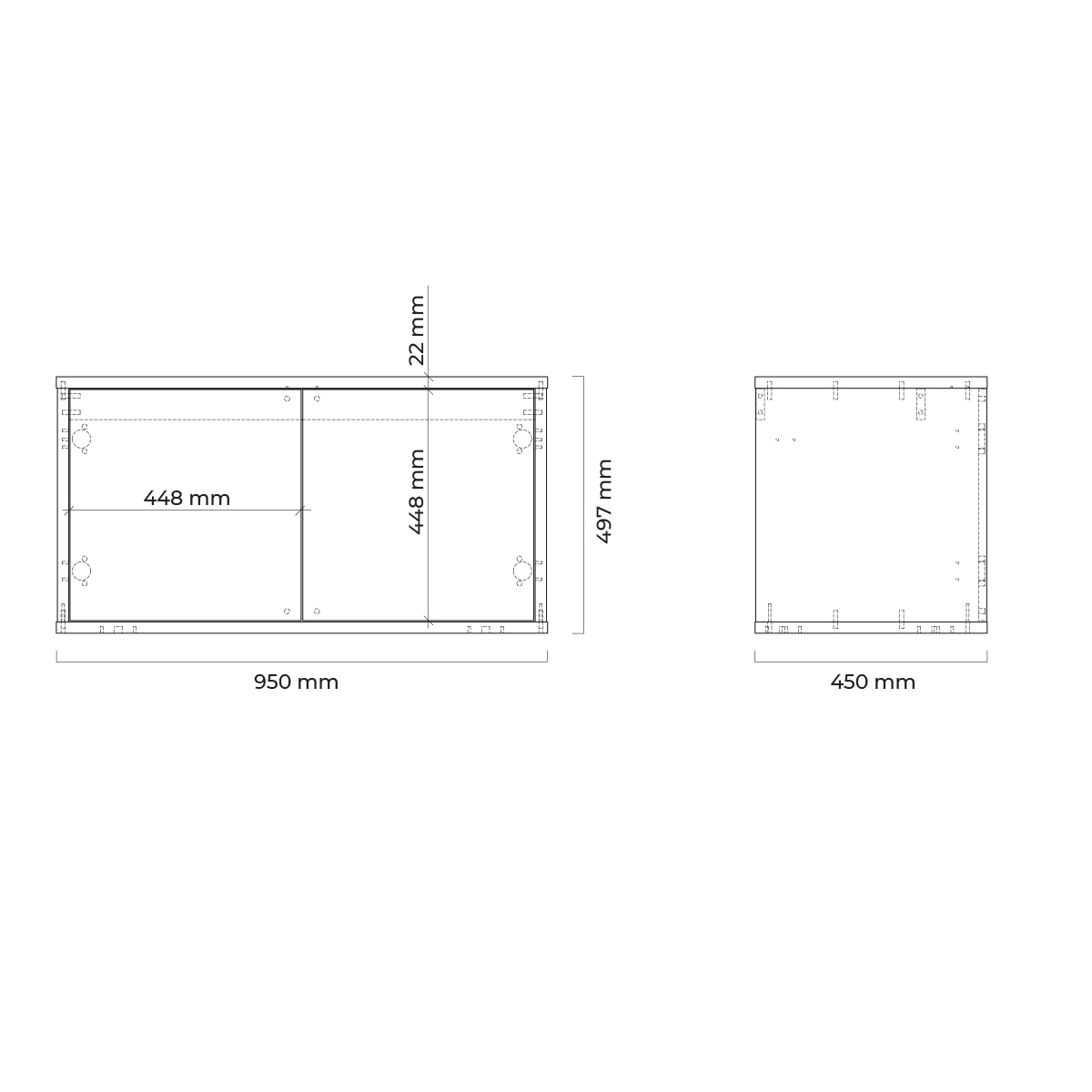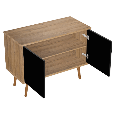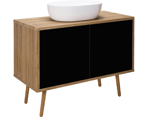 Schranktüren ohne Halter; sie öffnen sich nach einem leichten Druck auf die Front mit einer mechanischen Öffnungshilfe. Um sie zu schließen, müssen Sie nur leicht auf die Vorderseite des Schranks drücken. Schrank aus Platten mit UV‑beständiger schwarzer Mattlackierung und eichenFarbener Schichtstoffplatte.