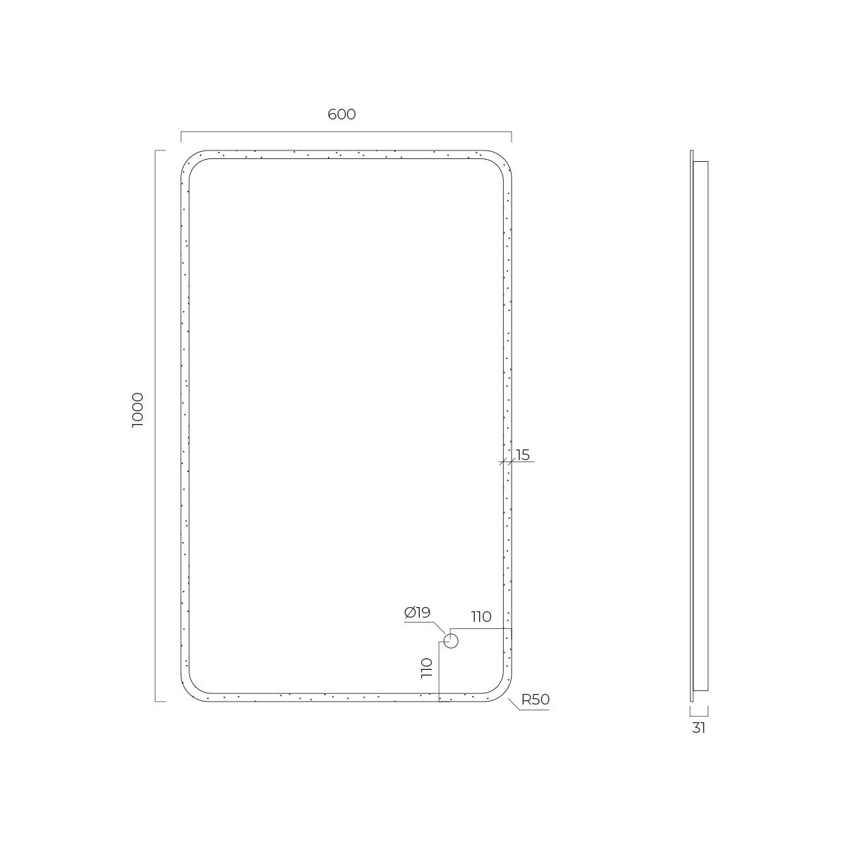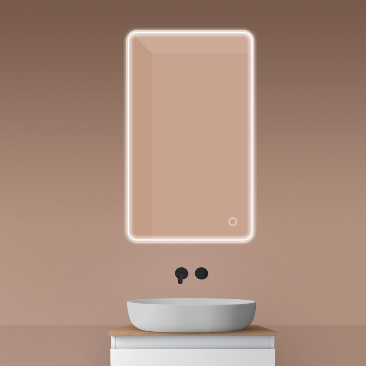 - Beleuchtung in Form eines 1,5 cm breiten Streifens an der Vorderseite des Spiegels