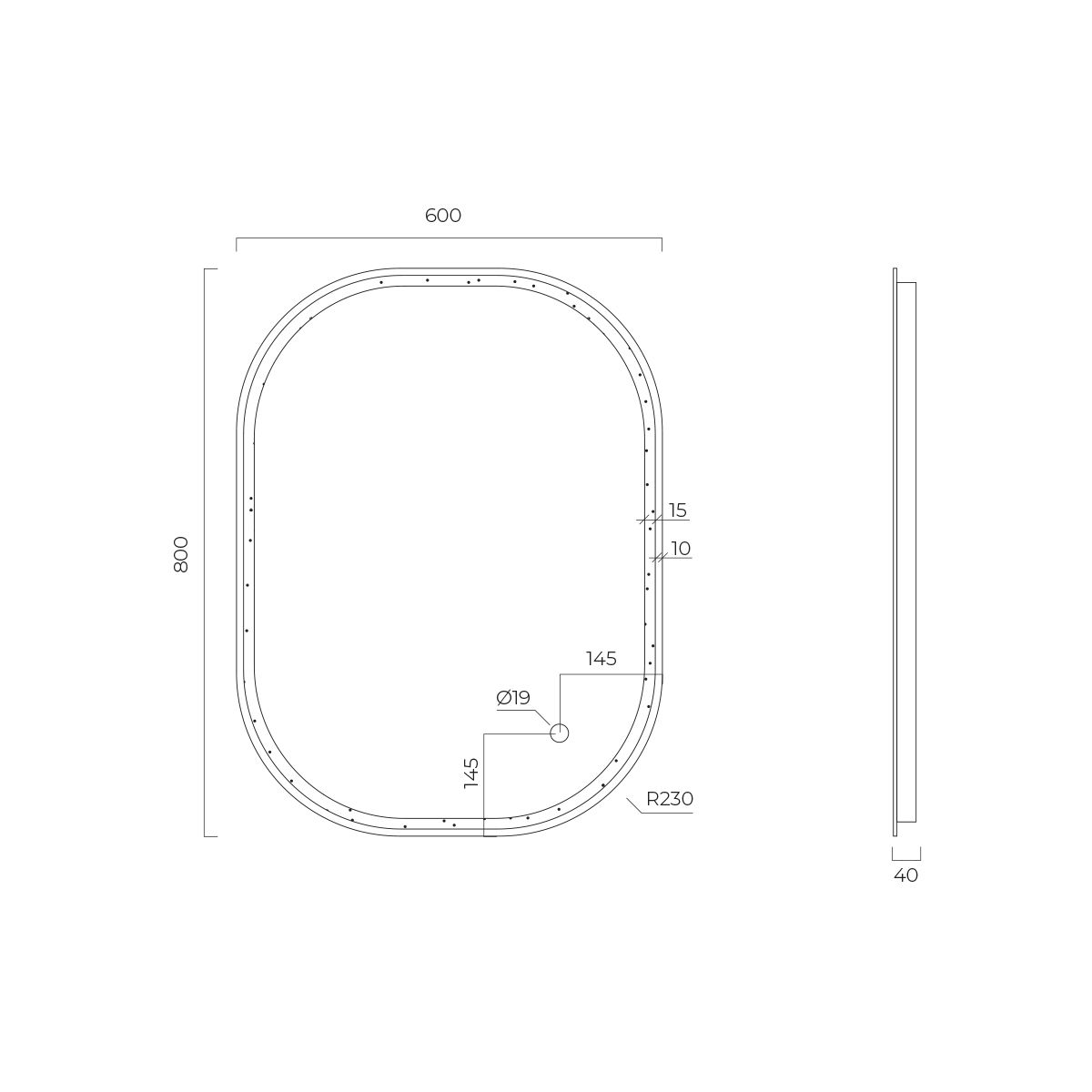 - Beleuchtung in Form eines 1,5 cm breiten Streifens an der Vorderseite des Spiegels