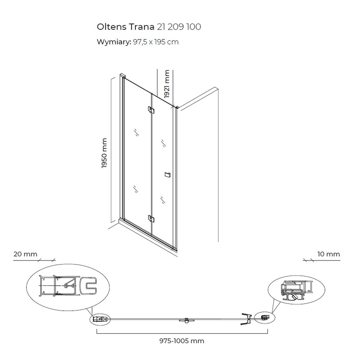 Zweiteilige Duschtür, 2 Teile beweglich, Falttür. Minimale ‑ maximale Breite 97,5‑100,5 cm (Einstellmöglichkeiten 30 mm)