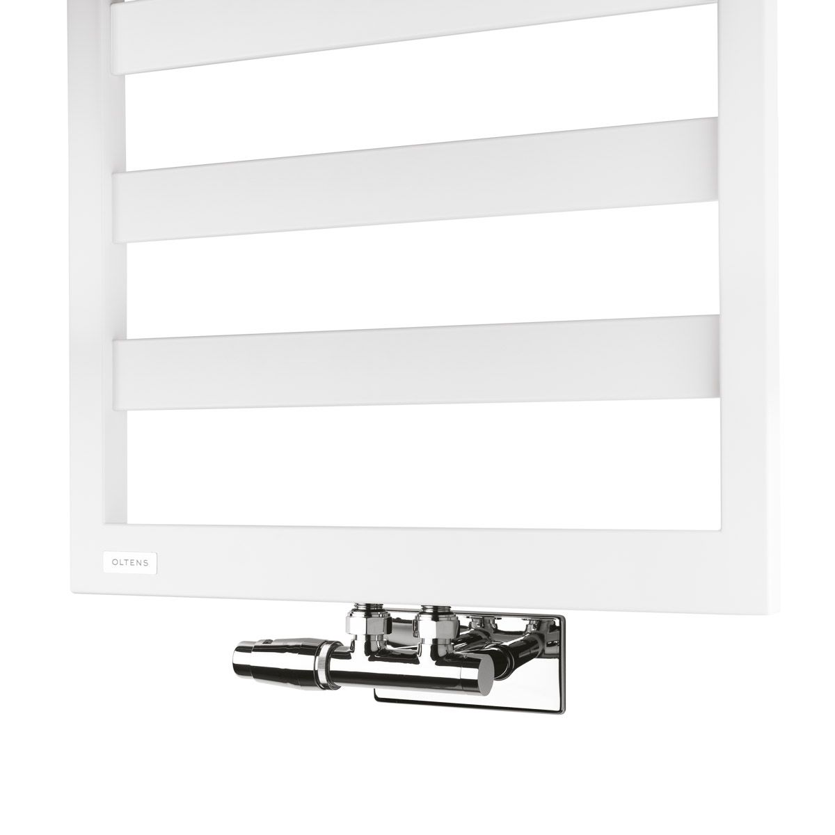Kompletter Ventilsatz für die Montage eines Heizkörpers mit Mittelanschluss und einem Abstand von 50 mm. Der Satz besteht aus einem Anschlussblock mit eingebautem Thermostatventil, einem Absperrventil und einen Thermostatkopf. Geeignet sowohl für die Montage in Zentralheizungsanlagen aus Kupferrohren 15x1 als auch aus Kunststoffrohren PEX/AluPEX 16x2. Alle Elemente des Sets sind farblich auf die Heizkörper der Marke Oltens abgestimmt.