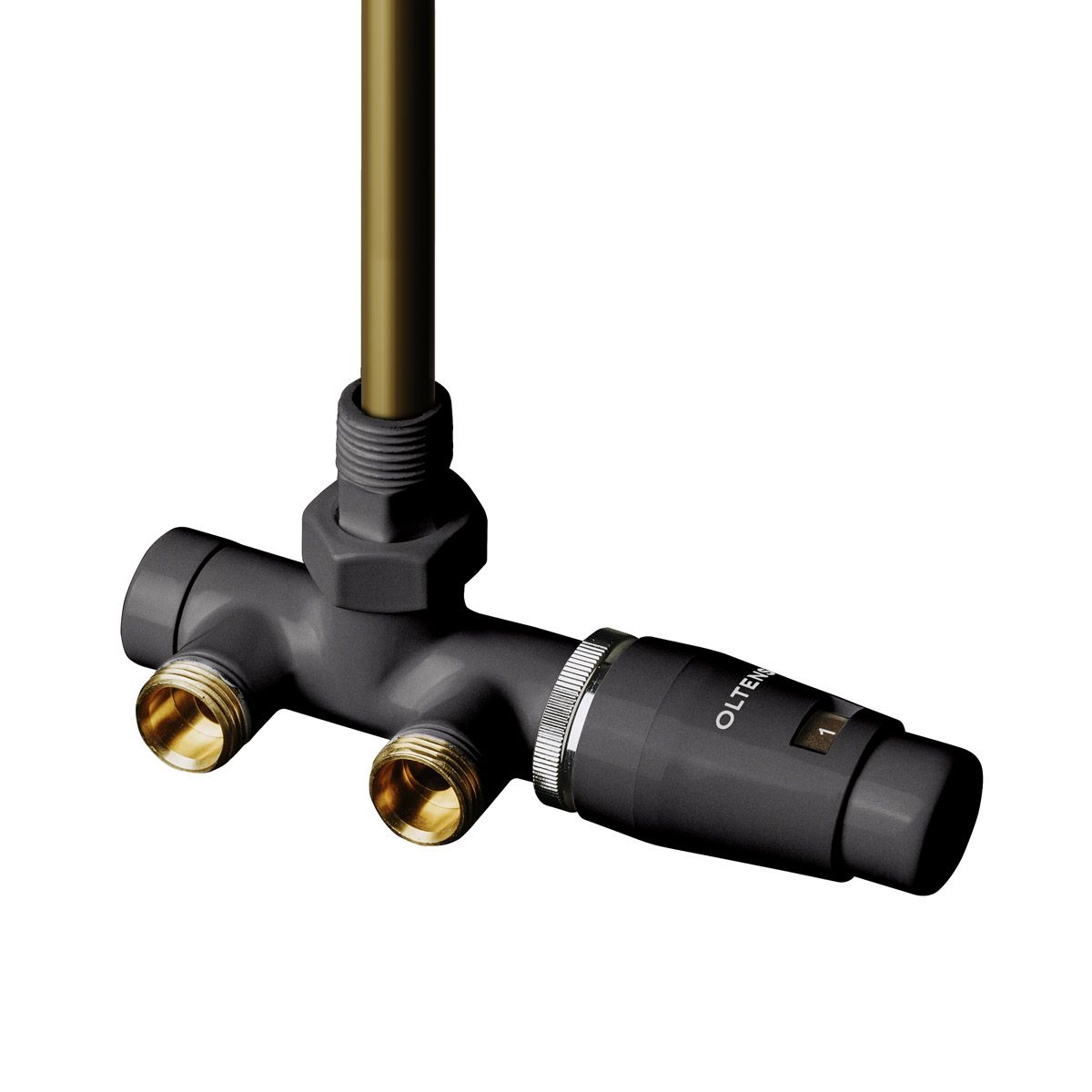 Das Einloch-Anschlussset besteht aus einem Kombiventil mit Thermostatventil und Absperrventil, einem Thermostatkopf der Marke Oltens, der am Ventilkörper befestigt ist, und einem 30 cm langen Sammlerrohr.